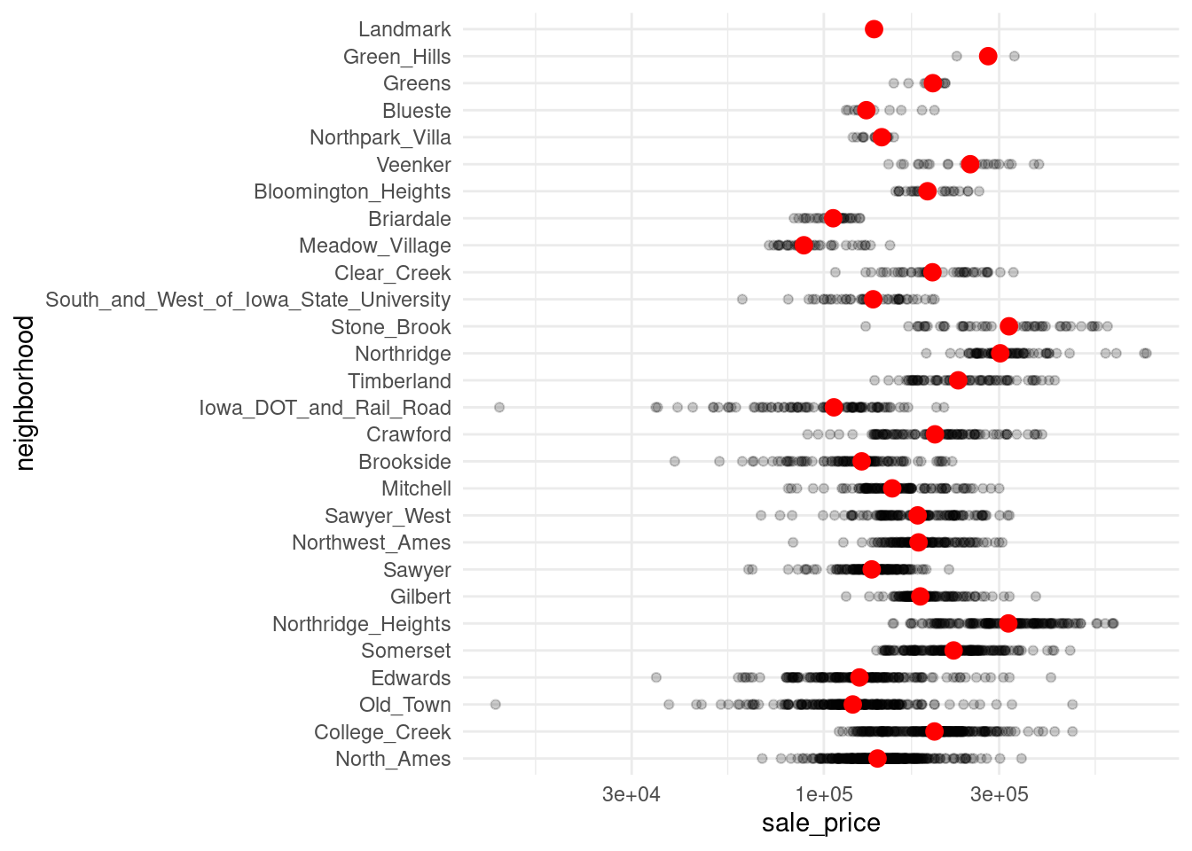 Shockingly, data wrangling does not have value in itself. I know that as mathematicians/statisticians/number crunchers it is hard to imagine that. However, incorporating a calculated value in a visualizations can generate insights. And many people find that more valuable. Take a look at two examples that use this idea. Both consider the ames data from {modeldata}.