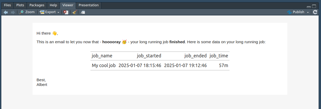 If you run this, you’ll see that the HTML email message is displayed in RStudio’s viewer window.